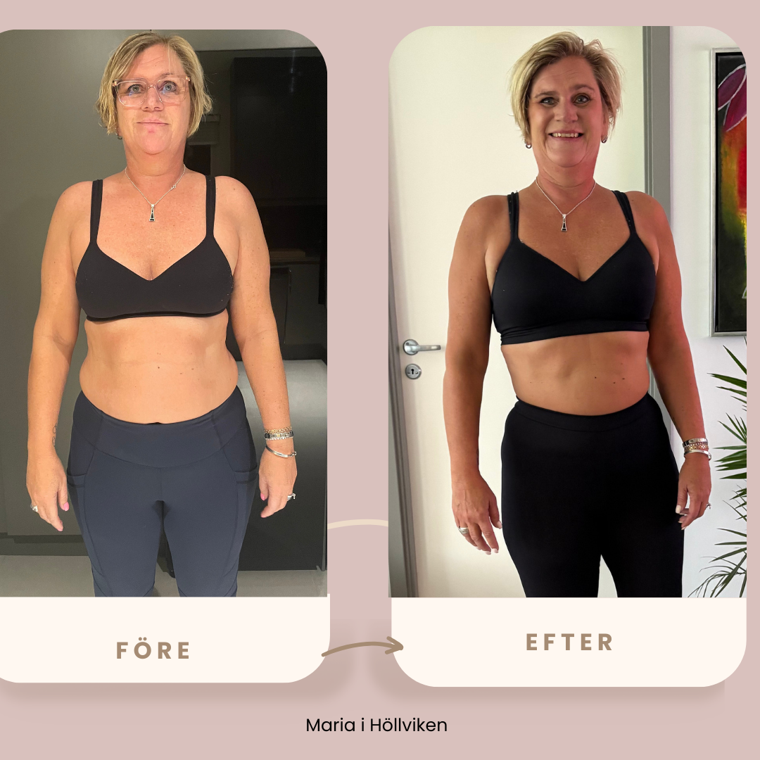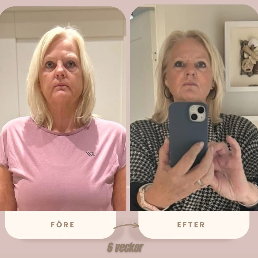 ”Jag känner ett annat glow i mitt ansikte, tyvärr är ju rynkorna kvar men påsarna under ögonen har liksom stramats upp. Jag är mycket piggare och har en helt annan energi, sover bättre, min ”översta” mage har sjunkit och är inte i vägen. Inga svettningar eller toabesök”